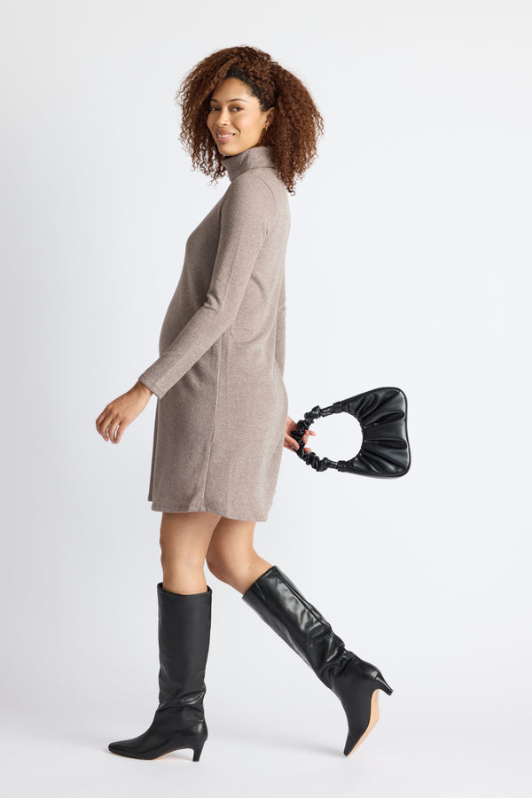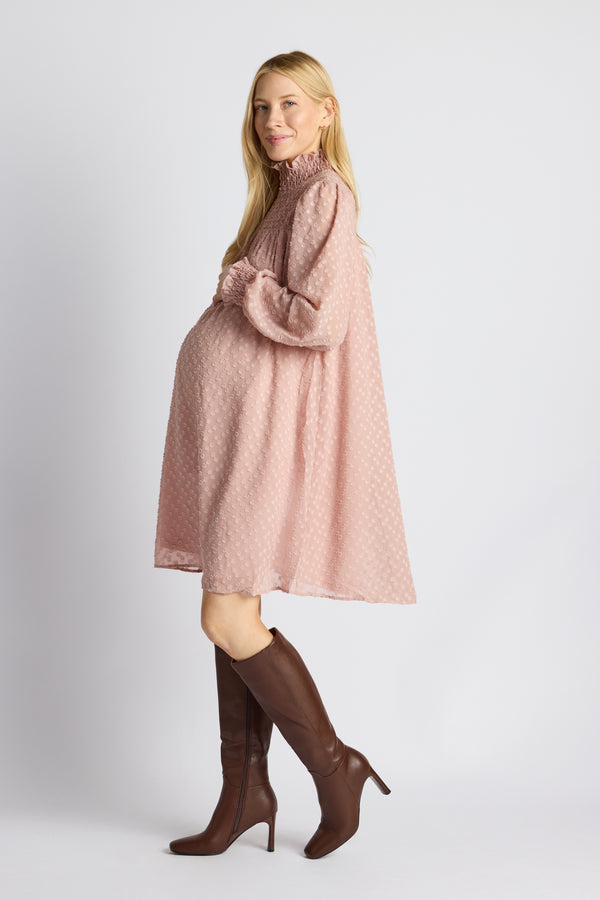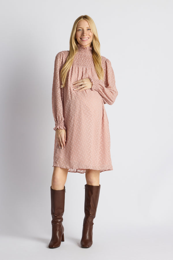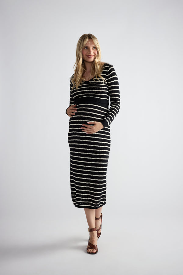 Introducing the smart and timeless staple your fall wardrobe needs. This long sleeve maternity dress is made for your growing journey — first trimester to fourth. A durable, stretchy waist lets this dress bloom with your belly. The button-down bodice gives you nursing access for when the babe gets hungry. Soft brown pinstripes take your look from easy to elevated. We love how the mid-thigh skirt is layered for additional flair. Rock this brown maternity dress with wedges, pumps, boots, or flats.