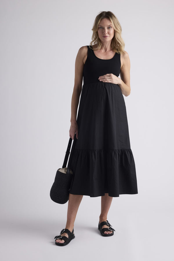 A maternity midi dress with a cinched waist and detailed straps. Cut outs on each side that merge in the back.