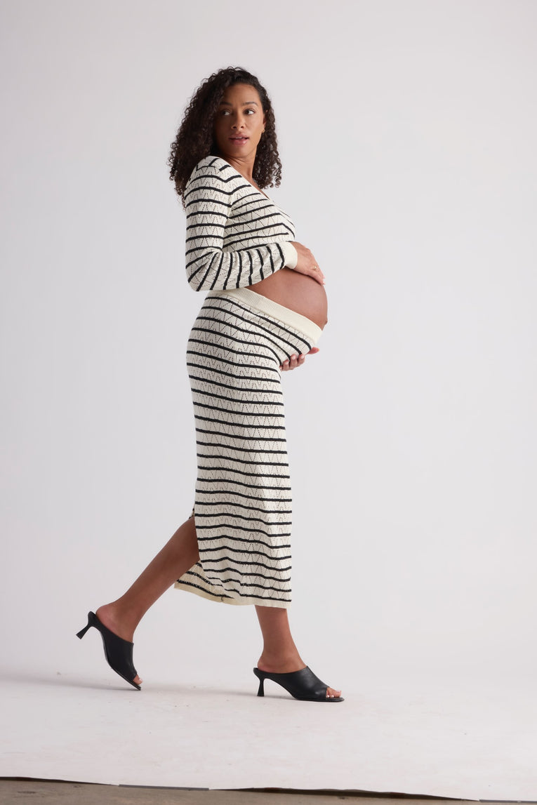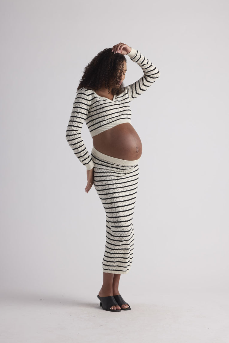 Soft knit maternity 2 piece set. Top has a V-neckline with long sleeves. Skirt is midi length and comfortable.