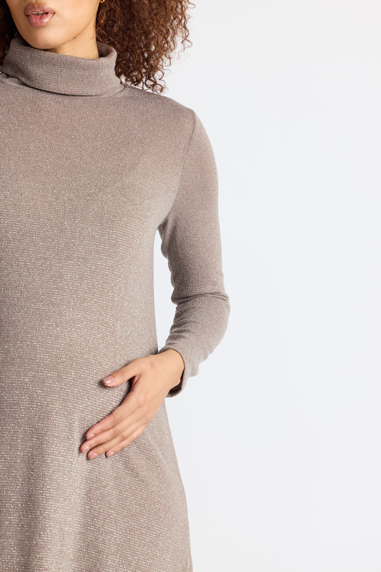 Cozy comfort meets a hint of sparkle with the Kaia dress, your perfect piece for pregnancy and beyond—especially for the holidays. This knee-length style, woven with a touch of shimmer, adds just the right amount of festive shine while keeping you effortlessly comfortable. With a chic turtleneck and long sleeves, it's ideal for layering, and the soft, luxurious fabric keeps you feeling amazing all day and night.