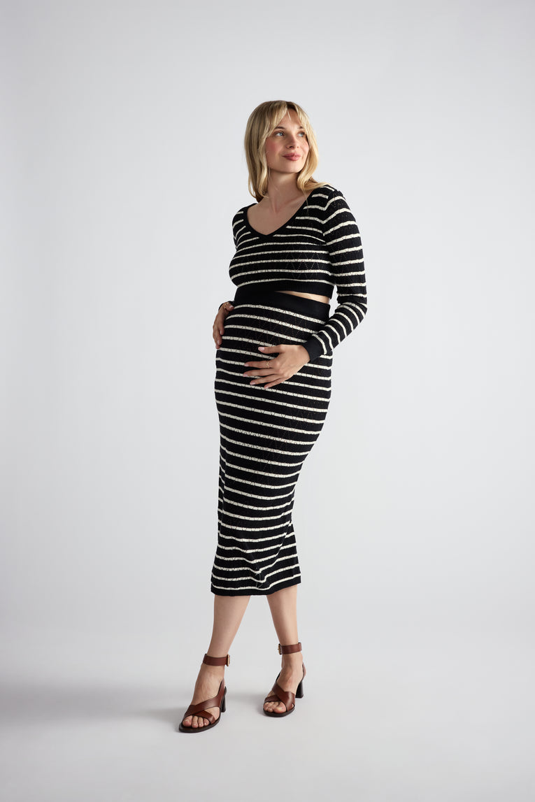 Introducing the soft knit maternity two-piece set that pairs effortless style with supreme comfort. The top features a flattering V-neckline and cozy long sleeves, while the midi skirt offers a stretchy, comfortable fit that moves with you. This dynamic duo is perfect for those days when you want to look polished but feel relaxed. Embrace maternity chic with ease.
