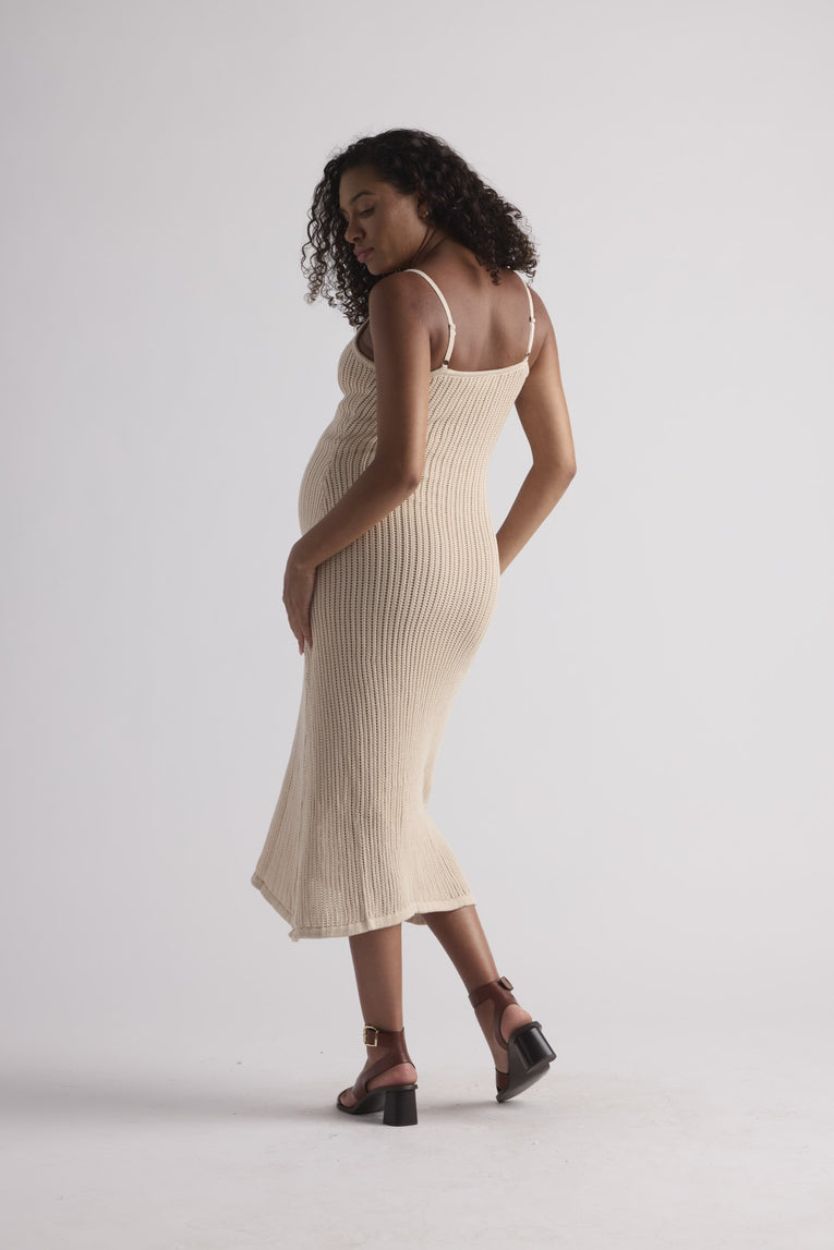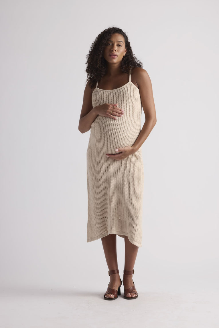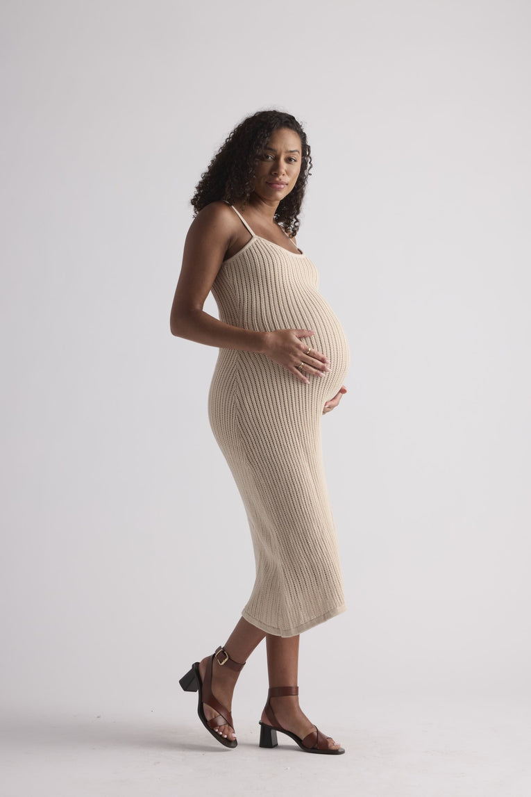 Soft, luxurious, and oh so cozy. What’s not to like? This nude maternity midi dress up the comfort and class. The breathable material helps regulate your temperature to keep you comfy in the spring, summer, or fall. This casual maternity dress has a relaxed fit so you have room to grow. We love how the knit texture adds a chic touch, too. Since this dress features a muted color and camisole design, the accessory options are endless! Get fun with your favorite jewelry, layers, and more.